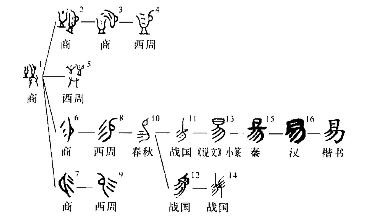 會意字。像雙手持器(有鋬)向另一器(無鋬)傾注液體之形。該字構形的發展可以分為繁簡二系。繁系包括1-5各形,其通行時間為商代到西周,其中2(省去雙手形)、3(省去雙手形及有鋬器之圈足形)、4(省去雙手形及無鋬器形)各形是1逐步簡化的結果,而5則是1的直接繼承,只是雙手的位置放在兩器的正下方,與初文放在有柄之器下者有所不同。簡系包括6-12各形,其存在時間為商代至今。其中6或7形應看成由4形所代表的有柄之器經過截除性簡化而形成的,即截取器形中靠近鋬的部分和器中的液體,而省去其他部分。12則是簡系中為追求美觀而有意繁化的結果。易字本義當為傾注(此義不見于文獻,而表示注水器的匜字可能是其同源詞),引申為賜予,后代一般用賜(賜)記錄這個意義。旅鼎:“公易(賜)旅貝十朋。”臣卿鼎:“臣卿易(賜)金。”《商君書·錯法》:“夫離朱見秋豪百步之外,而不能以明目易人;烏獲舉千鈞之重,而不能以多力易人。”又引申為更易。甲骨文常見“易日”一語。《易·系辭下》:“上古穴居而野處,后世圣人易之以宮室。”文獻中常見的“難易”之“易”,應該看成借字(無本字)。(孟蓬生)