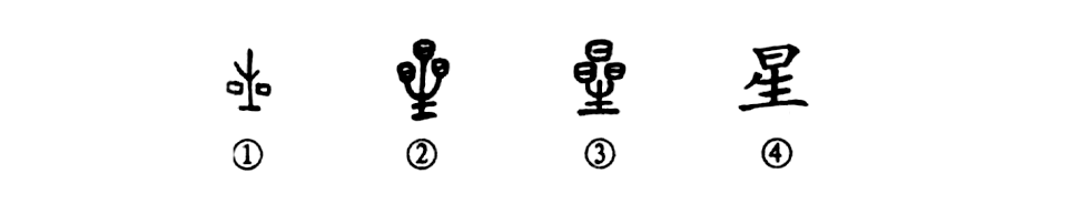 “星星點點撒夜空”的“星星”,也正如甲骨文①左右兩個小方塊。金文②上部的三個“日”字,更是夜空繁星的形象。甲骨文中間像小樹苗的部分和金文除去三個“日”的部分就是“生”字。③是小篆的形體,與金文的形體相似。到了楷書④則去掉了兩個“日”,寫為“星”。