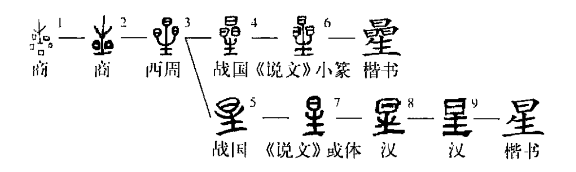 形聲字。甲骨文作“”。其中“”像群星之形,從“生”得聲。或省作“”。甲骨文中“曐”多假借為“夝(晴)”字:“乙巳,明雨,伐? 既雨。咸伐,亦雨? 施卯鳥星(晴)。” (《合集》11497正)金文作“曐”。從晶,生聲。戰國文字或作“星”字。《說文》:“曐,萬物之精,上為列星。從晶,生聲。一曰象形。從口,古口復注中,故與日同。”所說的“一曰”云云,顯然有誤。所以“星”本指群星,后也指單獨的星體。古代所說的“星”,包括今天所說的“恒星”、“行星”、“流星”、“彗星”等等。后也引申指“小的斑點”等等。今簡化為“星”。(王志平)