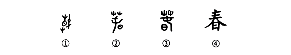 這個“春光明媚”的“春”字是一個會意兼形聲的字。從甲骨文①看,說它是會意,其左邊的上下兩部分都是屮(草),中間是“日”,真可謂旭日東升,綠草萌發,大地回春了;說它是形聲,其左是形,“日”在春草中,表意,其右是聲符“屯”(“十”字木架上面纏了一團線,也就是“純”字的初文)。金文②的位置發生了較大的變化,把聲符“屯”移到了中間。小篆③也基本上同于金文,只是“屯”的曲筆朝右拐。④是楷書的寫法,“草”和“屯”發生了較大的偽變,成了“??”,根本看不出原義了。