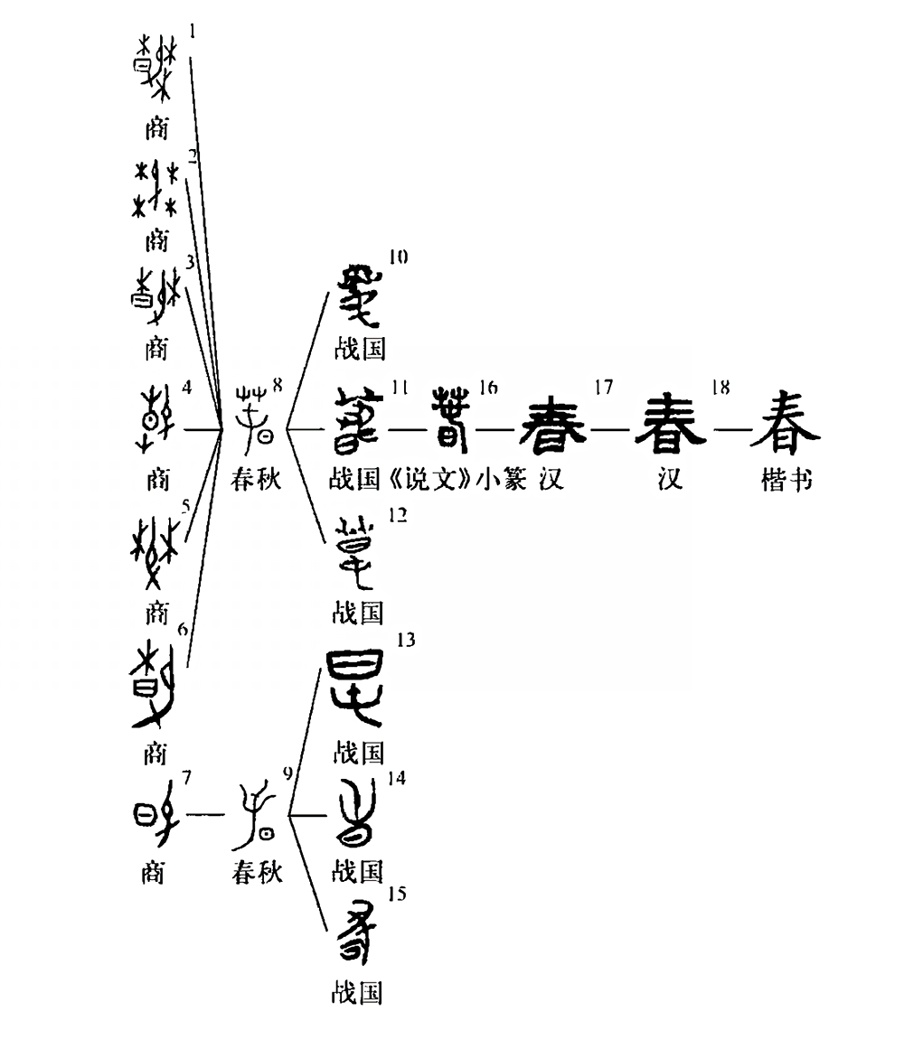 形聲字。甲骨文從四木、三木、二木、一木不等(木或改從屮,古文字中從木從中每不別),從日,屯聲。也有少數省木或屮,為從日,屯聲。本義是指一年四季中的第一季,即春季。《廣韻·諄韻》:“春,四時之首。”《公羊傳·隱公元年》:“春者何?歲之始也。”春秋文字“春”字僅從艸,無從木者。另外,甲骨文中從日、屯聲之“春”字此時繼續使用,這種寫法的“春”字一直沿用到戰國時代。戰國文字承襲春秋文字,或省“日”旁。秦代小篆承襲戰國文字中從艸、從日,屯聲的“春”字寫法。漢代文字“春”字隸變作“”、“”,為今日楷書所本。(白于藍)