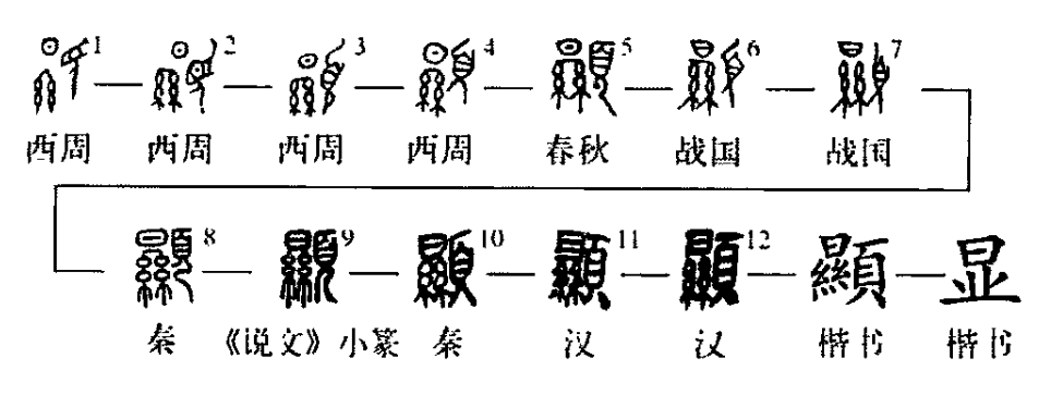 會意字。《說文》:“顯,頭(頭)明飾也。從頁,?聲。”又:“?,眾微杪也,從日中視,古文以為顯字。”《說文》及清代《說文》學家們多認為顯字之本義為頭明飾,引申為顯明之義,顯為?字的后起字。王筠《說文釋例》:“積古齋頌壺頌敦皆云:‘不顯魯休’,而頌鼎云:‘不?魯休’。一人之器而字作兩體,明乎其為一字也。”到目前為止,所見西周金文拓片中未見?字。?字最早見于戰國溫縣盟書,是戰國東方六國文字顯字的省體,《說文》所說以為古文,正是戰國東方六國古文。從西周金文看,應該是先有顯字,后有?字。顯字是個會意字,從頁從日從,像人在日光下視之形,會明顯、顯明之義,也正是《說文》訓“?”字為“從日中視”之義。顯、?本為一字,?為戰國時出現之省體,至《說文》分為二字二義,誤解顯字本義,將顯字本義放在字下。西周金文常見顯字,皆用為光明之義,如大盂鼎銘文:“不(丕)顯文王,受天有大命。”顯字現在為顯字的簡化字,最早產生于元明時代俗文學作品中。(周寶宏)