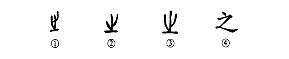 這是個“之”字。甲骨文①的下部一條橫線表示這個地方,上部是一只腳趾朝上的腳,表示“從這里出發(fā)”的意思。所以“之”字的本義是“往”的意思。②是金文的形體。③是小篆的形體,大致都與甲骨文的形體相似。④是楷書的形體,它是由小篆蛻變而來的。