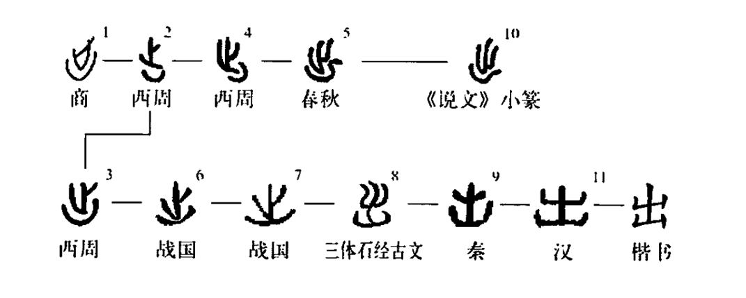 ,楷書的“出”字即由后者演變而成。本義是從里面到外面(跟“入”相對)。