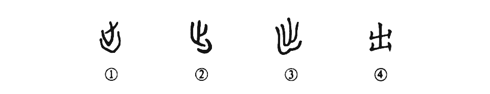 “東邊日出西邊雨,道是無晴卻有晴。”這是劉禹錫的兩句名詩。“日出”的“出”字,是個會意字。甲骨文①的下部是一條上彎的曲線,表示這是一個門口或土坑口,上部是一只腳趾朝上的腳,表示一只腳從門口或土坑口走出的樣子。金文②也是這個意思,只不過那個門口或土坑口偏到右邊了。小篆③發生了偽變,腳像個“山”字形,下面的門口或土坑口則仍能看出個大概。楷書④則變成了兩個“山”字的重疊形。