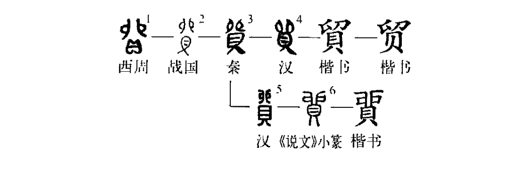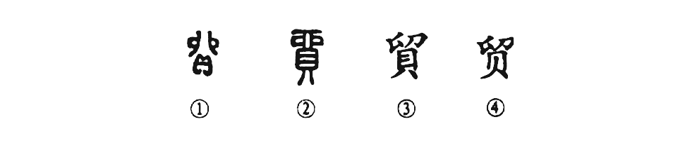 “貿遷有無,各得其所。”這個“貿”字本為形聲字。①是金文的形體。其上為“卯”,表聲,其下為“貝”,表形。②是小篆的寫法。③為楷書繁體字。④為簡化字。