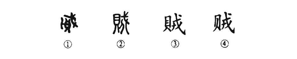 這是“射人先射馬,擒賊先擒王”的“賊”字。金文①的左邊是一只手,右邊是“戈”(武器),中間是“貝”(貴重之物),這就表示“手持戈破貝”之意。②是小篆的形體,“手”靠近“戈”,更有持戈的意思。③是楷書的寫法,與小篆的形體基本一致。④是簡化字。