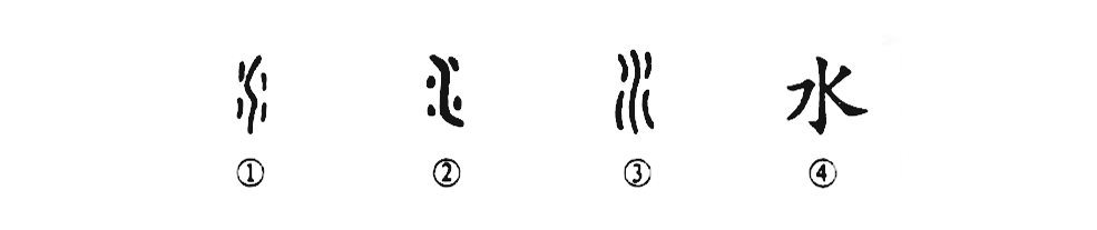 “雙手推開窗前月,一石擊破水中天。”這個“水”字是個象形字。甲骨文①的四個點之中有一條曲線,表示彎彎曲曲的水流之形。金文②和小篆③的形體基本上與甲骨文相同。④是楷書的形體,已經看不出流水之形了。(一豎筆就是甲、金文字中間的一條曲線,左右部分則代表甲、金文字的四個點兒。)