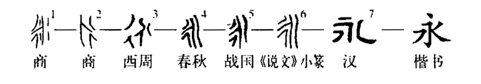 ”。“永”之金文、小篆略同甲骨文,只是右側水形變成一條實線。隸書、楷書筆畫化,失去原形。(馮華)