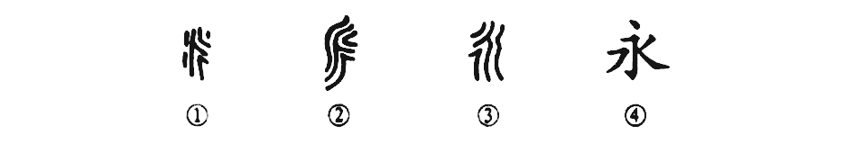這個“永”字是個象形字。甲骨文①就像水的主流所分離出來的一條向右的支流。金文②就更像水流的形狀,潺潺溪水、涓涓不息。③是小篆形體,與甲、金文字的寫法比較一致。到了楷書④,就變得看不出溪流的模樣了。
