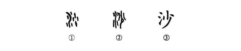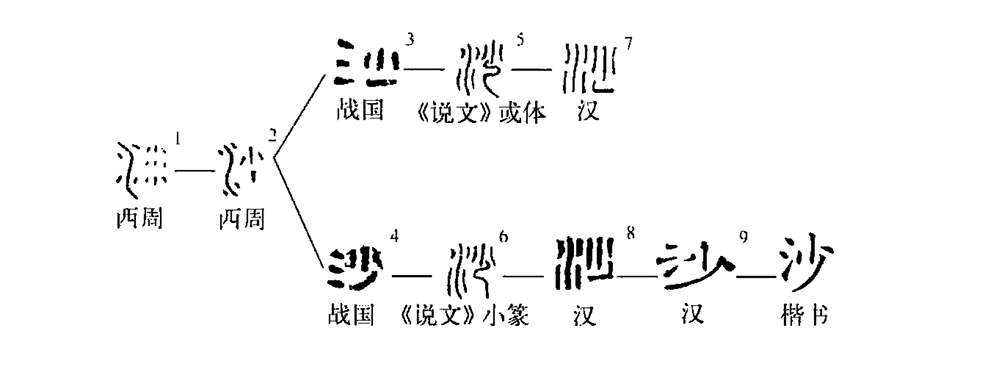 初文為合體象形字。像水及散碎沙粒之形。水旁數點本即沙形,恐沙形不顯,故從水,似亦兼具會意之義。金文與甲骨文大體同,唯表示沙粒的點數多寡之異。戰國文字形體漸趨統一,易象形為會意。
