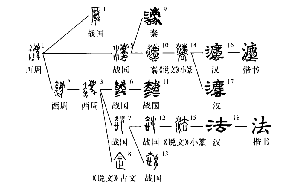 形聲字。從水(表示執法須公平如水),從廌(傳說中可以辨別是非曲直的動物),去聲(去聲古音兼屬葉部和魚部,這里取葉部讀音)。1和2為初文,部件的相對位置比較靈活。在字形發展的過程中,除了一脈相承維持初文結構基本不變的字形如7、12、13、15外,該字形體上的演變也有簡化和繁化、訛混三種情況。簡化的情況又分兩種:一是部件基本具備,而寫法漸趨草率,如3、5、8等。其中3的寫法特殊,實際上是聲旁去下部的口形與形旁水的上部共用部件凵(口的變形),是古文字發展過程中常見的借筆現象。二是省去構件,如6、9,省去了意符廌。繁化的情況如4,是增加一個部件“戶”。有的學者以為是從?聲,這應該是比較合理的解釋。訛混的情況如14。漢代隸書字形中廌或寫作鹿?!墩f文》古文為