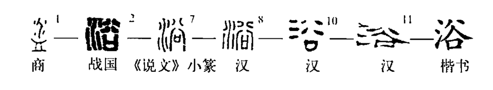 形聲字。從水,谷聲。甲骨文從人、從皿,又于人之身著水滴,像人浴于盆中之形。按:初文為會意。浴為后起之形聲字。
