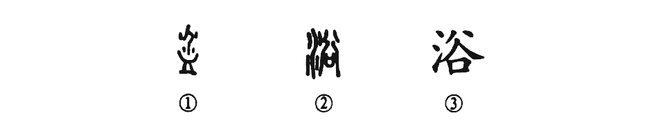 這個“浴”字本來是個會意字。甲骨文①的下部是一個大器皿,中間盛有水;水中站著一個曲背彎腰面朝左的人;人的周圍有四個點兒,表示人在洗澡。可是到了小篆②則發生了偽變,成了左形(水)右聲(谷)的形聲字了。③是楷書的形體,基本上同于小篆。