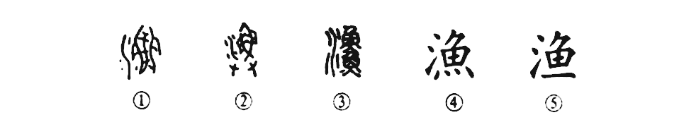 “月落烏啼霜滿天,江楓漁火對愁眠。”這個“漁”字是會意兼形聲的字。說它是會意:左“水”右“魚”,是在水中捕魚之義。說它是形聲,左形(水)右聲(魚),是個形聲字。甲骨文①的右邊是“魚”,左邊是“水”。金文②的形體繁雜多了,不過會意的意味更濃,上部的左邊是“水”,上部的右邊是“魚”,下部是兩只大手,這就表明在水中“撈魚摸蝦”就叫“漁”。小篆③卻變得沒有多少意思了,因為把金文中的雙手換成一條魚,反而造成了書寫上的不便。④是楷書形體,比小篆少了一條魚,很有必要。⑤是簡化字。