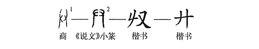 “”字一般都不單獨使用,而只是充當一個字的部首。凡由“”所組成的字大都與手或動作有關,“”到了楷書里,已變為“丌”或“廾”或“",如“具”、“戒”、“兵”等。