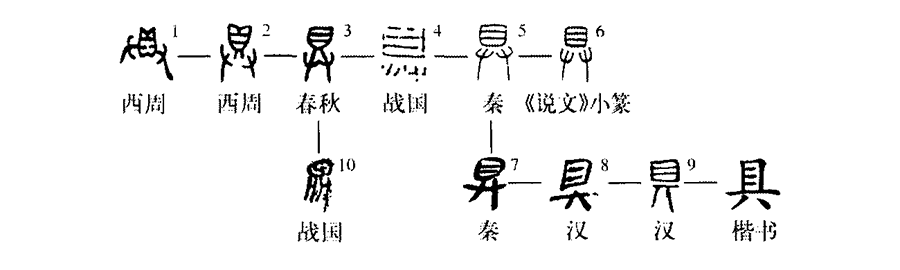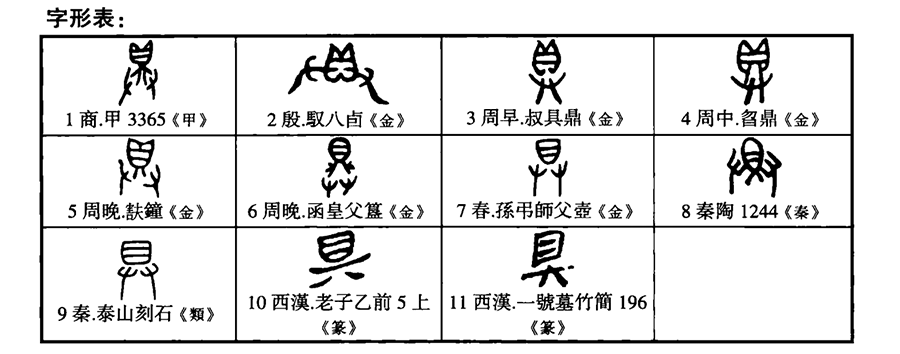 疑“具”字應(yīng)從升持鼎,會(huì)“準(zhǔn)備食物,供給賓客”之意,西周中晚期以後簡化為從“貝”,後來又簡化為從“目”。至於甲金文早期從升持貝的那個(gè)字,也有可能不是“具”字。