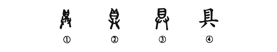 這個(gè)“具”字是個(gè)會(huì)意字。甲骨文①的中間是個(gè)“鼎”,下部的左右兩側(cè)是一雙手,手捧鼎就表示具備了。金文②的中間不是鼎,而是“貝”的繁體。貝在上古是很珍貴的東西,當(dāng)貨幣使用,雙手捧貝當(dāng)然也是“具備”或“具有”之義了。可是到了小篆③就發(fā)生了偽變,把甲、金文中的“鼎”、“貝”變成了“目”。④是楷書的形體,是由小篆直接變來的。