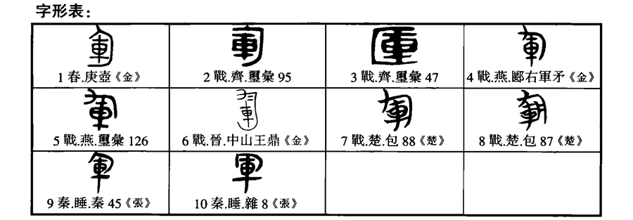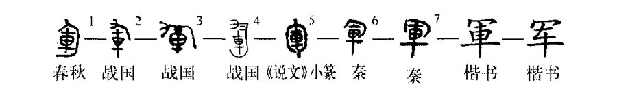 等皆為“勻”形之省變,而秦漢時(shí)代軍字從冖,從宀皆為進(jìn)一步演變。軍隊(duì)編制單位當(dāng)為“軍”字之本義,甲骨文稱軍隊(duì)為“師”,西周金文亦如此,至春秋金文叔夷鐘、庚壺銘文等始見(jiàn)稱軍隊(duì)為軍。(周寶宏)