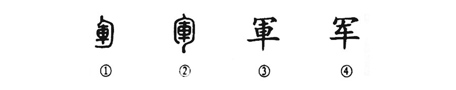 “昨夜見(jiàn)軍帖,可汗大點(diǎn)兵。”這個(gè)“軍”字是個(gè)會(huì)意字。金文①的中間是“車(chē)”,其外是環(huán)繞在周?chē)能姞I(yíng)。②是小篆的寫(xiě)法,大致同于金文的形體。③是楷書(shū)。④是簡(jiǎn)化字。